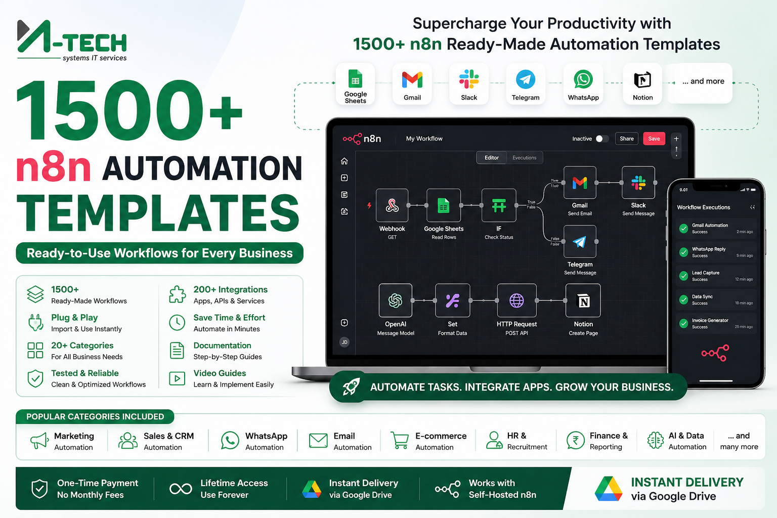 1500+ Ready-Made n8n Automation Templates Plug & Play Workflows (Import & Use Instantly) Covers 20+ Categories & Use Cases Built using n8n Official Nodes & Integrations Clean, Organized & Tested Workflows Documentation + Video Guide Included Lifetime Access – One-Time Payment Instant Delivery via Google Drive